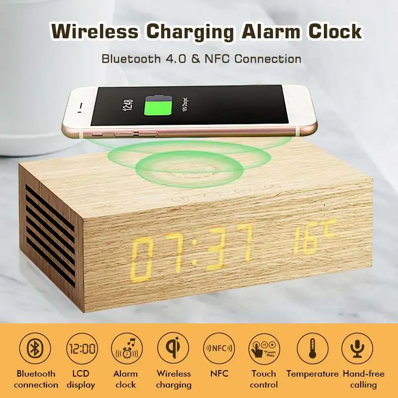 Wireless Charging Alarm Clock Bluetooth Speaker With Wood Grain Design And Bright Led Display For Iphone X Hands Free Calling Alarm Clocks Aliexpress